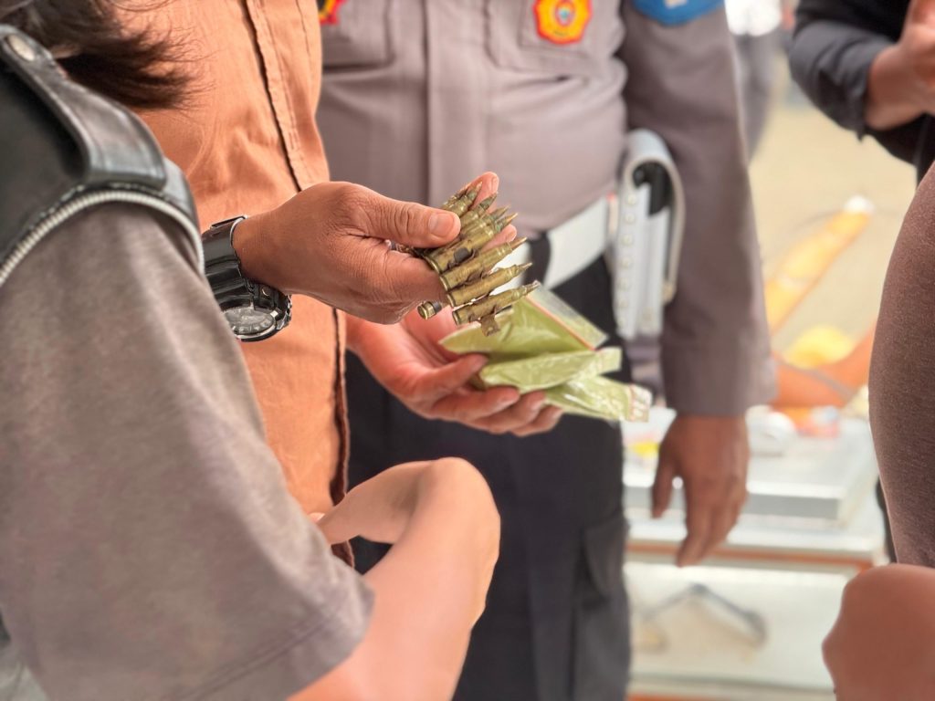 Seorang pria berinisial RF didapati membawa barang bukti berupa 15 butir selongsong peluru yang telah dimodifikasi secara unik menjadi gelang tangan. Dan Empat bungkus bubuk kratom, suatu zat yang tengah diawasi ketat oleh pemerintah karena memiliki efek menyerupai narkotika dan masuk dalam kategori zat adiktif.